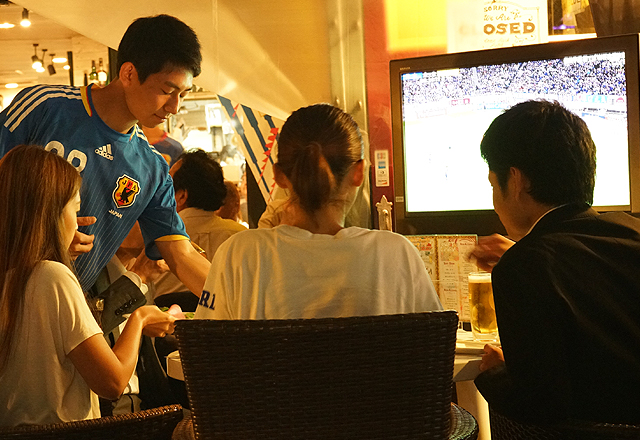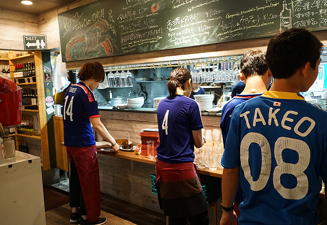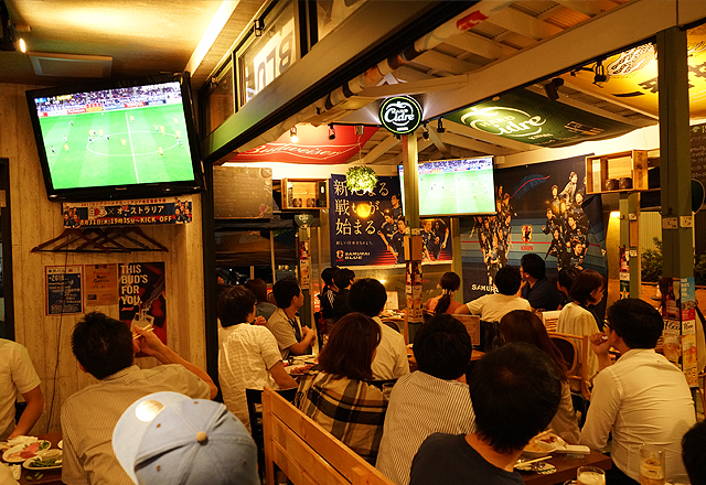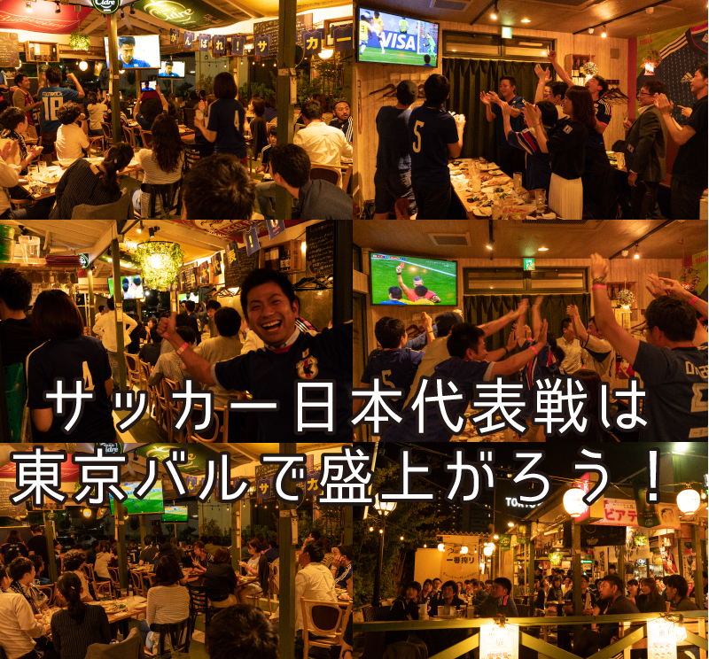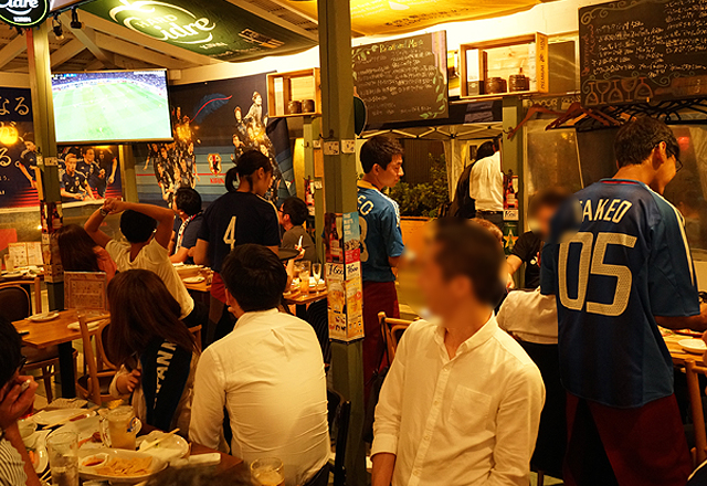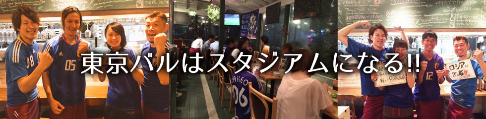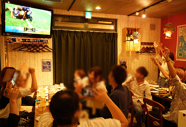 サッカー観戦 東京バルタケオはサッカー日本代表を全力で応援しています。スタッフと一緒にサムライブルーを全力で応援しましょう。(●o≧д≦)o頑張れェェェ♪ 店内に設置してある大型液晶テレビでサッカー日本代表戦をお楽しみいただけます。